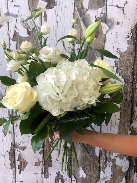 All white bouquet consisting of luscious hydrangeas, white roses, white Lilly and lisanthus